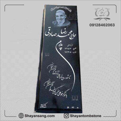 طرح بالا یک نمونه از سنگ قبر ساده و ارزان قیمت از سنگ قبر سیمین میباشد، برای اجرای آن از یک قطعه سنگ قبر گرانیت اصفهان به قطر ۳ سانتیمتر و ابعاد ۱۸۰ در ۶۰ سانتیمتر استفاده کردهایم که طرحی ساده دارد. این سنگ دارای یک دست قرنیز گرانیت ۲ سانتیمتری نیز میباشد که از آن در اطراف سنگ استفاده کردهایم. این مدل از طرح سنگ قبر پدر جدید میباشد که بسیار ساده و شکیل است و متن و شعر سنگ قبر پدر کار شده بر روی سنگ، ابتدا زمانی که سنگ خام است، به صورت دستی بر روی آن توسط خطاط طراحی میشود و بعد از تایید مشتری با استفاده از سنگ فرز تمامی نوشته ها و اطلاعات متوفی حکاکی میشود.